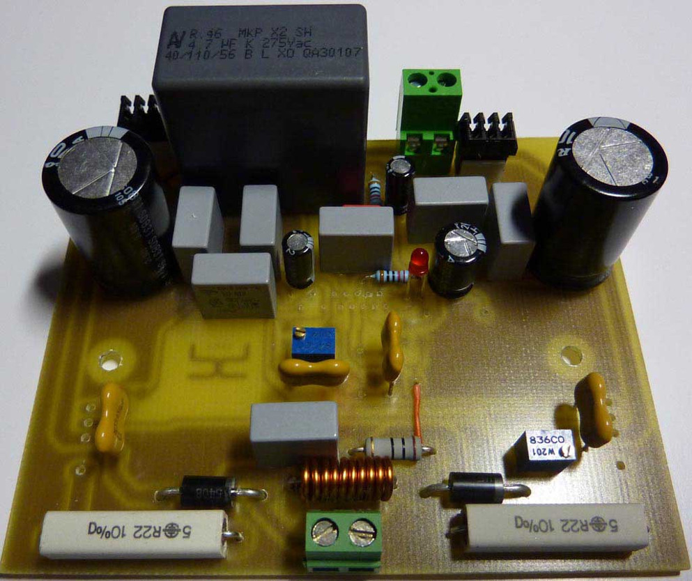 enosmerna napetost ojačana za vrednost napetostnega ojačanja ojačevalca (~25x). Če enosmerne napetosti ni, se lahko kondenzator izpusti. 275V