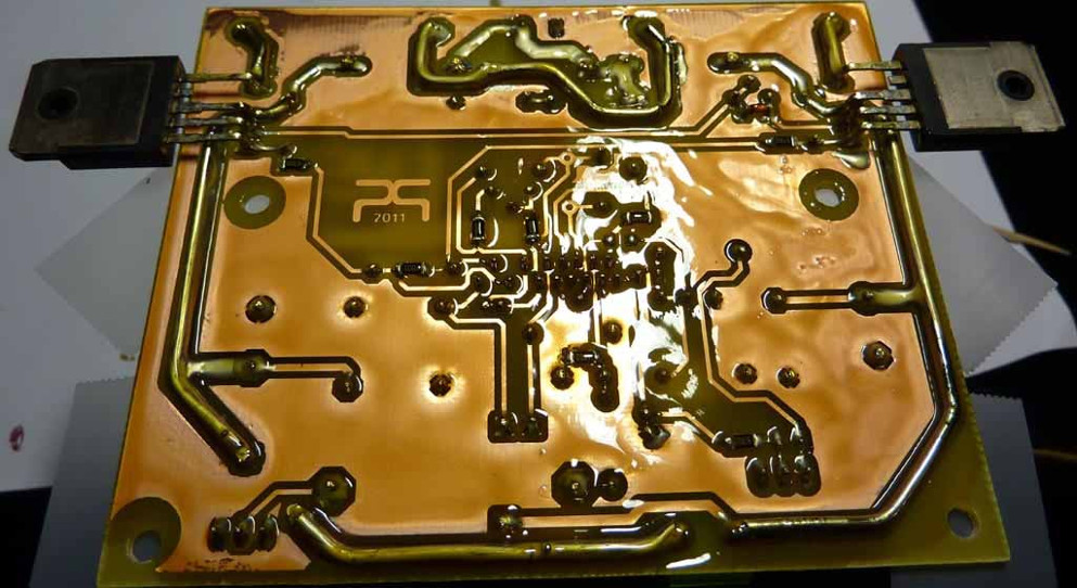 Spodnja stran vezja za usmerjanje in distribucijo močnostne sekundarne napetosti še pred spajkanjem ojačitev vezja in pred nanešeno zaščito vezja: