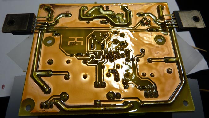 Sledila je montaža vezja ojačevalca, ki sloni na štirih distančnikih. Seveda je med ohišje tranzistorja in izolacijsko ploščico sodila tudi