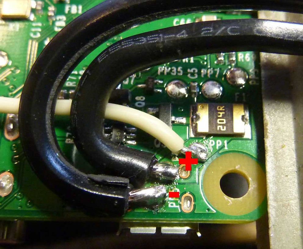 Slika 1: Priklop napajalnika. Nad belo žico je 2A varovalka za celoten RPI - USB, ker sem vezje modificiral. Zato tudi bela žica.